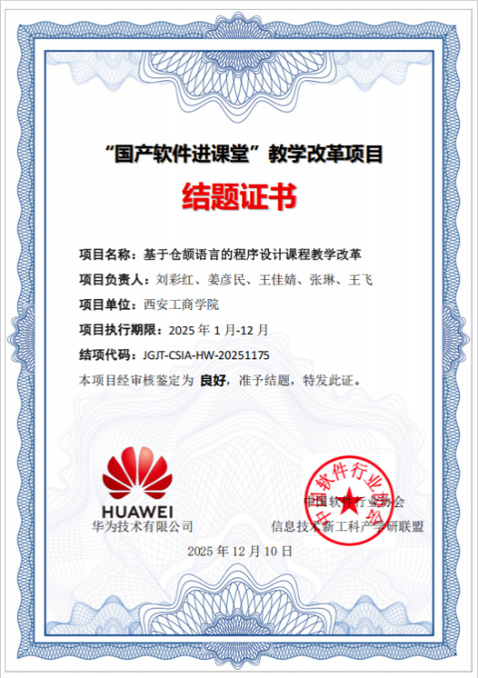 为深入贯彻落实党的二十大精神,积极响应国家软件自主创新战略,扎实推进国产编程语言进课程、进课堂、进教学,西安工商学院信息工程学院积极参与由中国软件行业协会、信息技术新工科产学联盟联合华为技术有限公司组织的“国产软件进课堂”教学改革项目。近日,由刘彩红老师和郭薇老师分别主持的两项教改项目顺利完成结题,均获评“良好”等级,标志着学院在国产软件教学融合与课程改革方面取得重要阶段性成果。