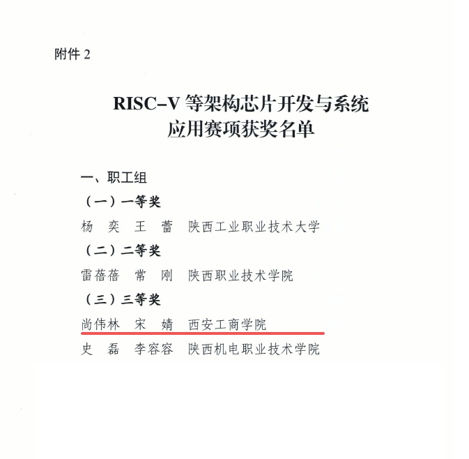 近日,陕西省工业和信息化厅发布通知,公布了第四届陕西省工业和信息化技术技能大赛的获奖名单,西安工商学院信息工程学院尚伟林、宋婧两位教师组成的参赛团队荣获“RISC-V等架构芯片开发与系统应用”赛项职工组省级三等奖。
