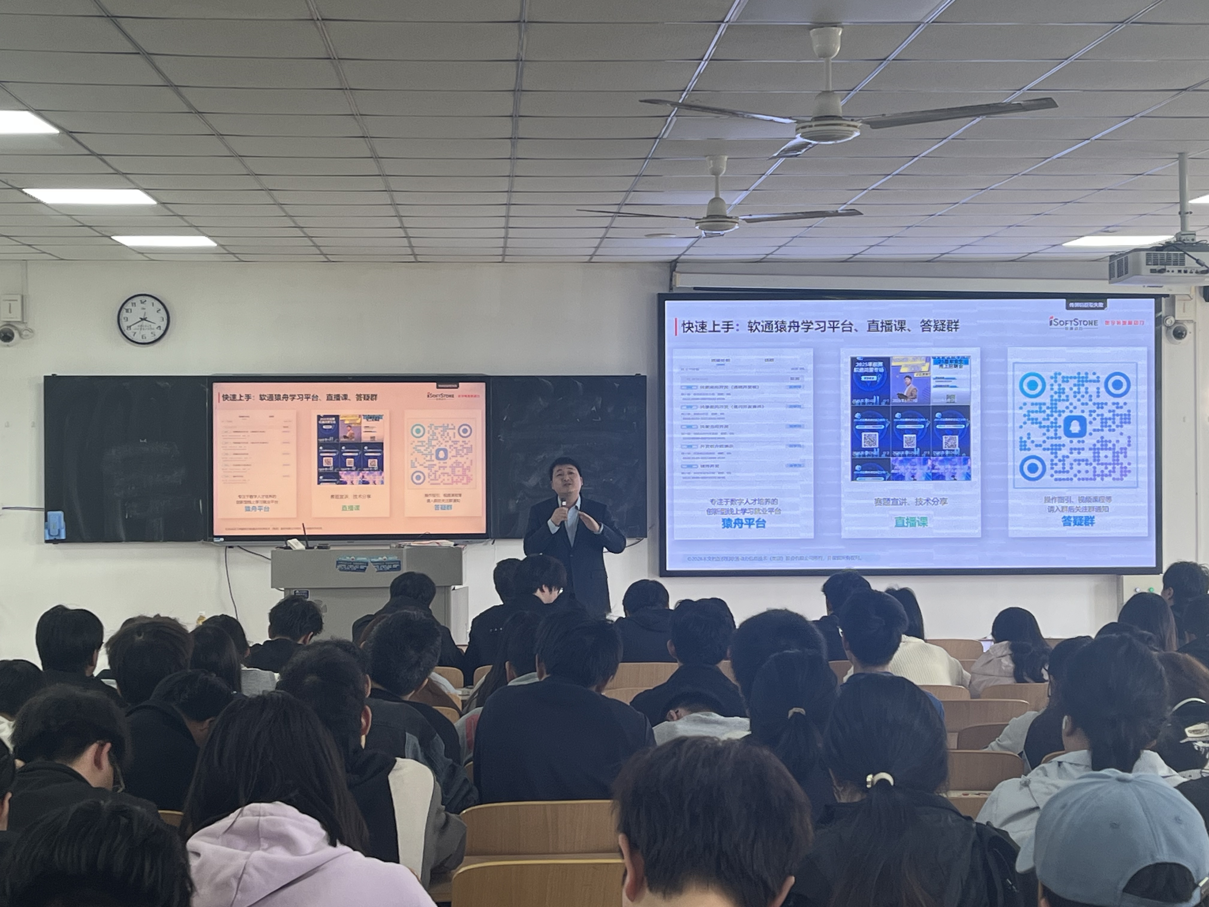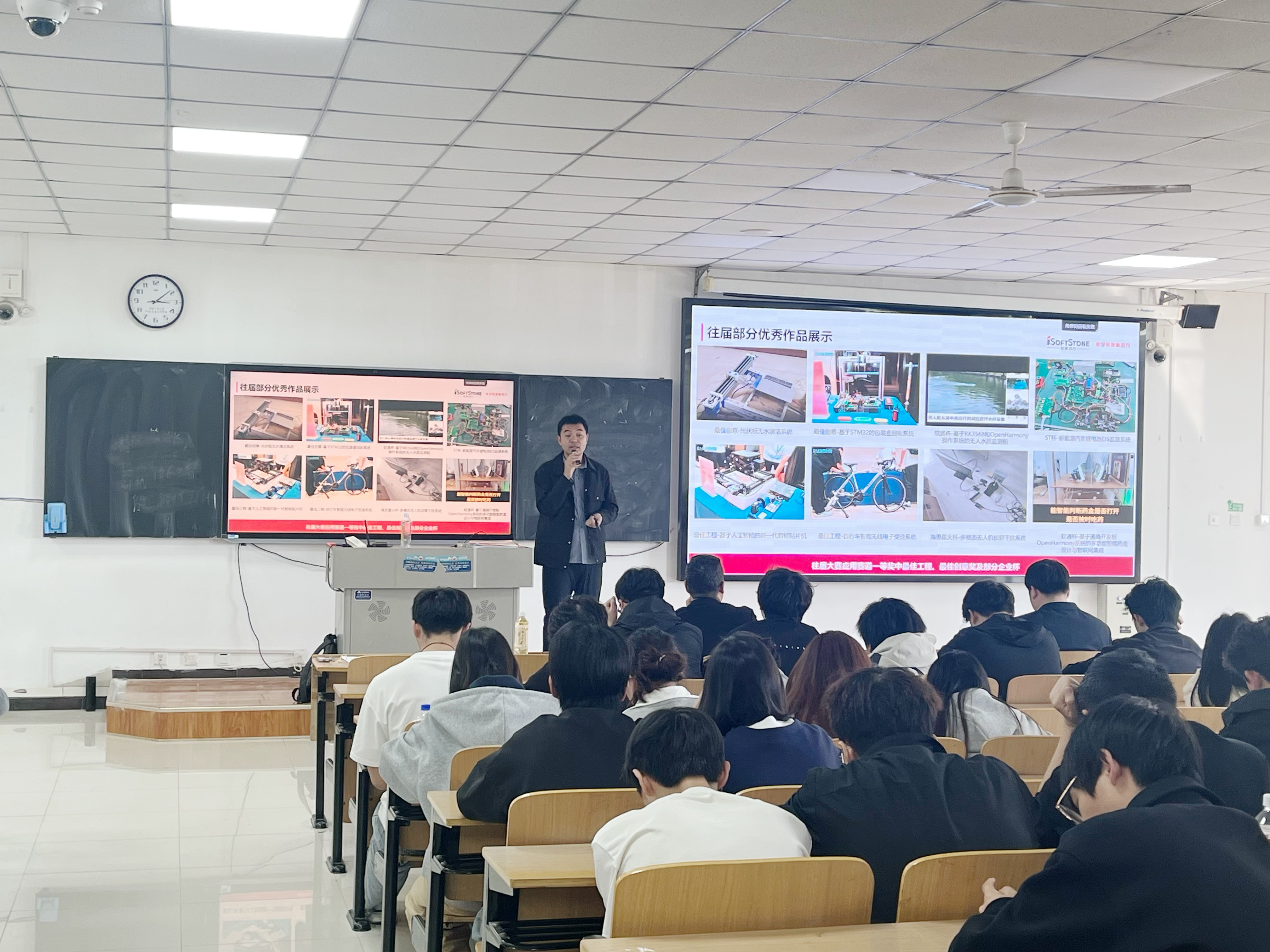 讲座现场,张展总监结合行业前沿与丰富项目经验,围绕嵌入式竞赛赛制规则、备赛流程、选题方向、核心技术及团队协作等内容进行系统讲解。他针对学生“理论扎实、实操不足”的普遍问题,详细梳理了从课堂知识到竞赛应用的转化路径,分享了实用备赛策略与实战技巧,内容深入浅出、干货满满,有效帮助同学们扫清入门盲区、树立参赛信心。