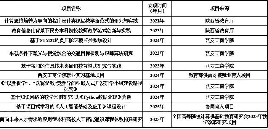 近三年来,教研室教师持续深化科研工作,共发表学术论文15篇,出版软件著作3项,并获得国家知识产权局和国家版权局多项授权。团队积极承担校级、部级及国家级科研项目,通过扎实的课题研究不断凝练学科方向,提升整体科研水平与创新能力,为学校学科发展注入了持续动力。
