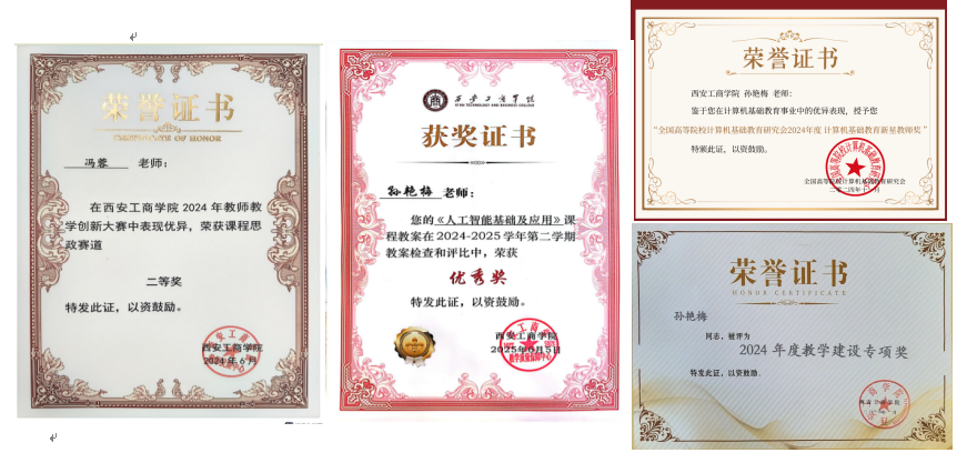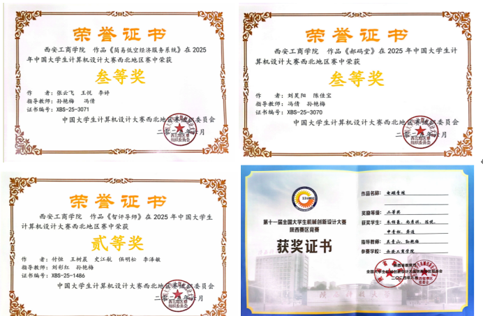 团队教师在各个领域屡获殊荣:高峰老师荣获陕西省五一巾帼标兵、西安工商学院教学名师、“诺奖马斯金教学名师”等称号;孙艳梅老师获得陕西省优秀工会工作者、全国高等院校计算机基础教育新星教师奖等称号;冯蓉老师在教师教学创新大赛中获奖,并获评优秀共产党员和突出贡献个人;郗华、贾金娜等老师多次获评校级考核优秀个人。在竞赛指导方面,高峰老师和孙艳梅老师多次荣获优秀指导教师奖,指导学生在“挑战杯”、机械创新设计大赛等赛事中获得金奖、银奖等佳绩。