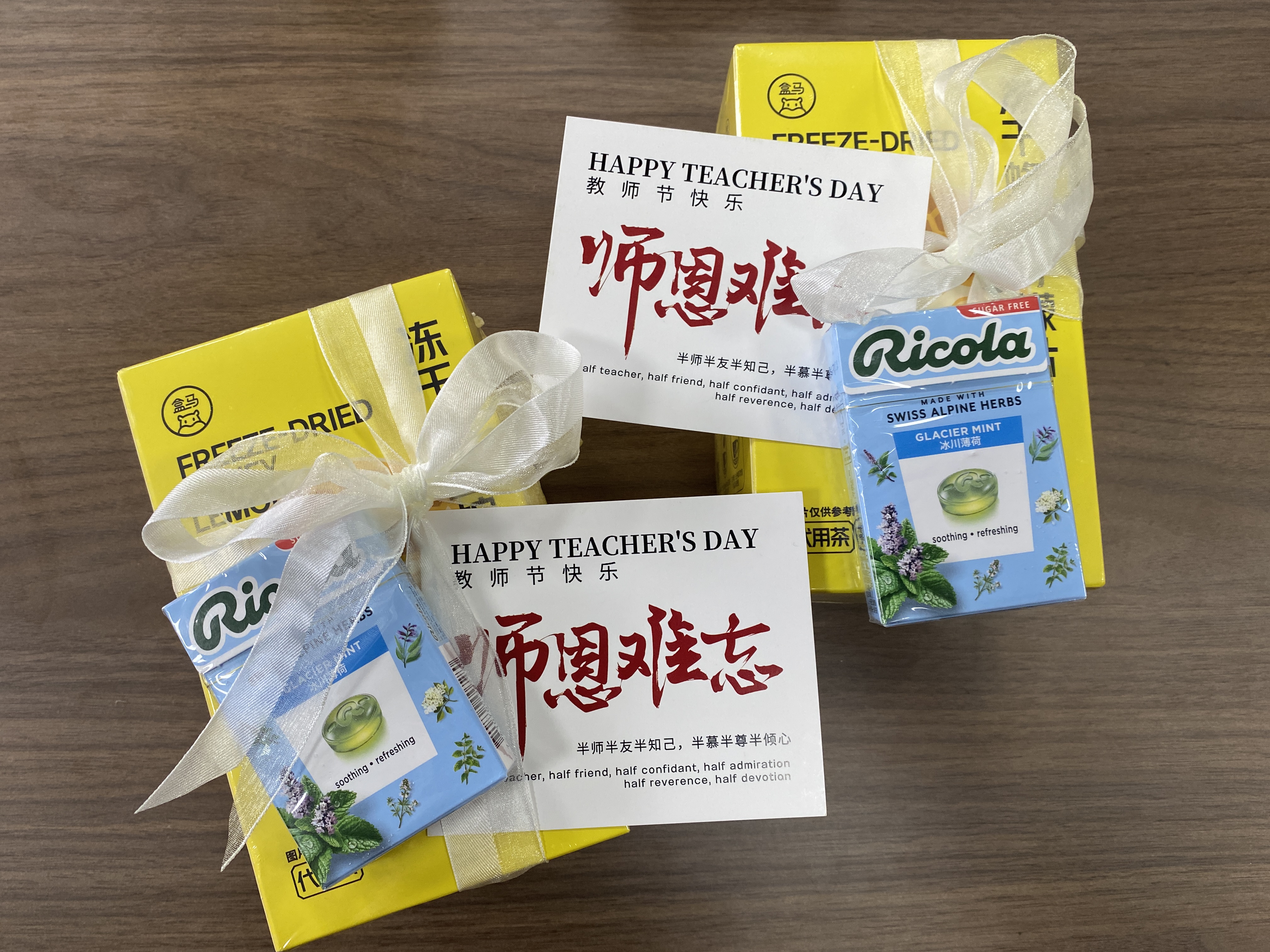从行政办公室到教学课堂,一份份满载深情的礼物在师生之间传递,小小的润喉糖融化在口中,甜意在心间蔓延,手写卡片上的每一个字都像是一束光,照亮了这个特别的日子。学生代表童同学表示:“老师们平日里为我们付出了太多,这次准备润喉糖,就是希望能为老师们缓解辛劳,让他们感受到我们的关心。”