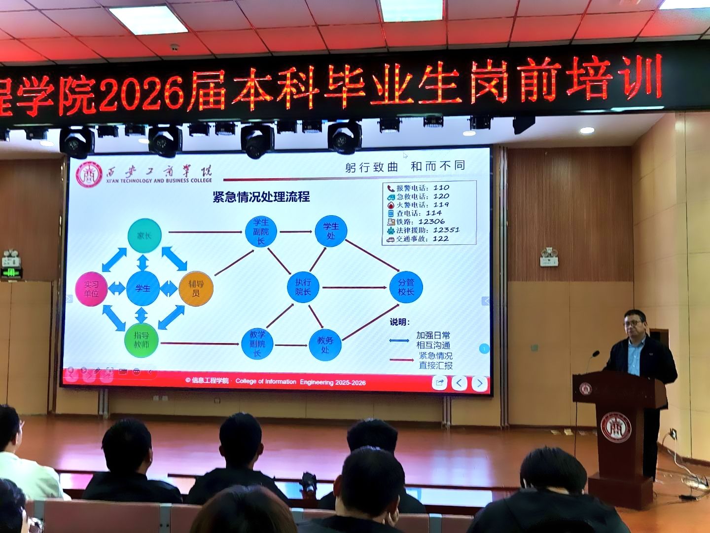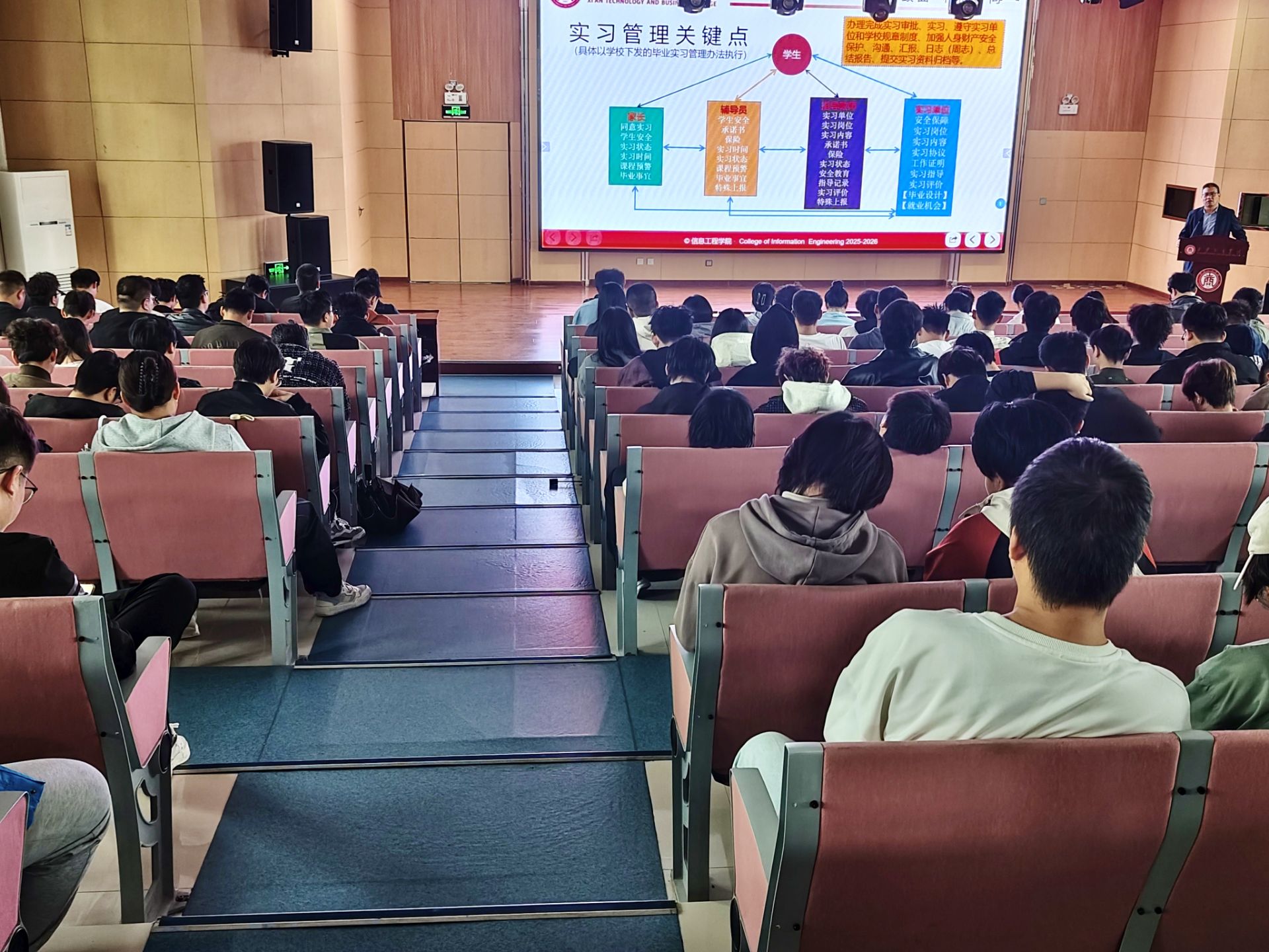 为顺利推进2026届毕业生实习工作,确保每位同学能够安全、有序地踏上实习岗位,信息工程学院分别于2025年9月22日与2025年10月11日在学术报告厅分两批次召开2026届毕业生毕业实习、毕业设计(论文)专项工作动员大会。信息工程学院教学副院长王飞及全体毕业生参加。