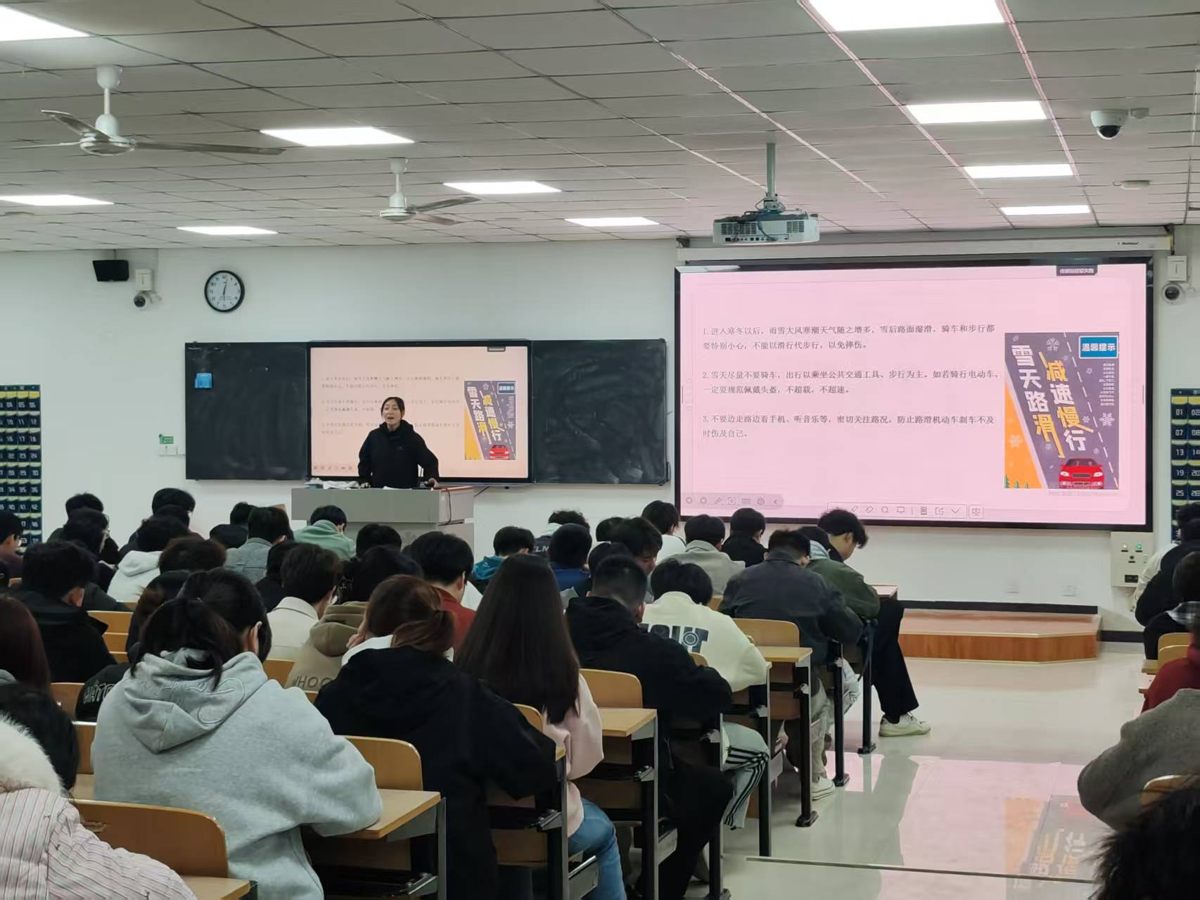 班会现场,辅导员结合近期校园周边交通事故案例,重点讲解了骑行安全与乘车规范。“骑行电动自行车和摩托车务必佩戴头盔,过马路时坚决摒弃‘闯灯抢行’的侥幸心理,遇到结冰路段要减速慢行”,相关安全提示通过图文展示和情景模拟,让同学们深刻认识到交通安全的重要性。