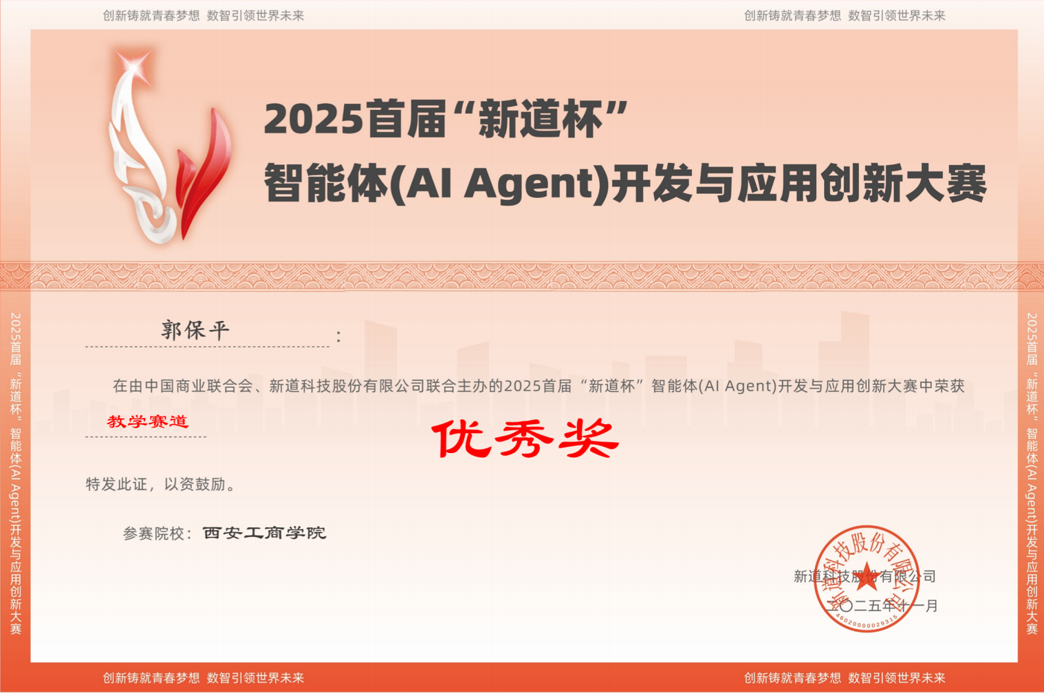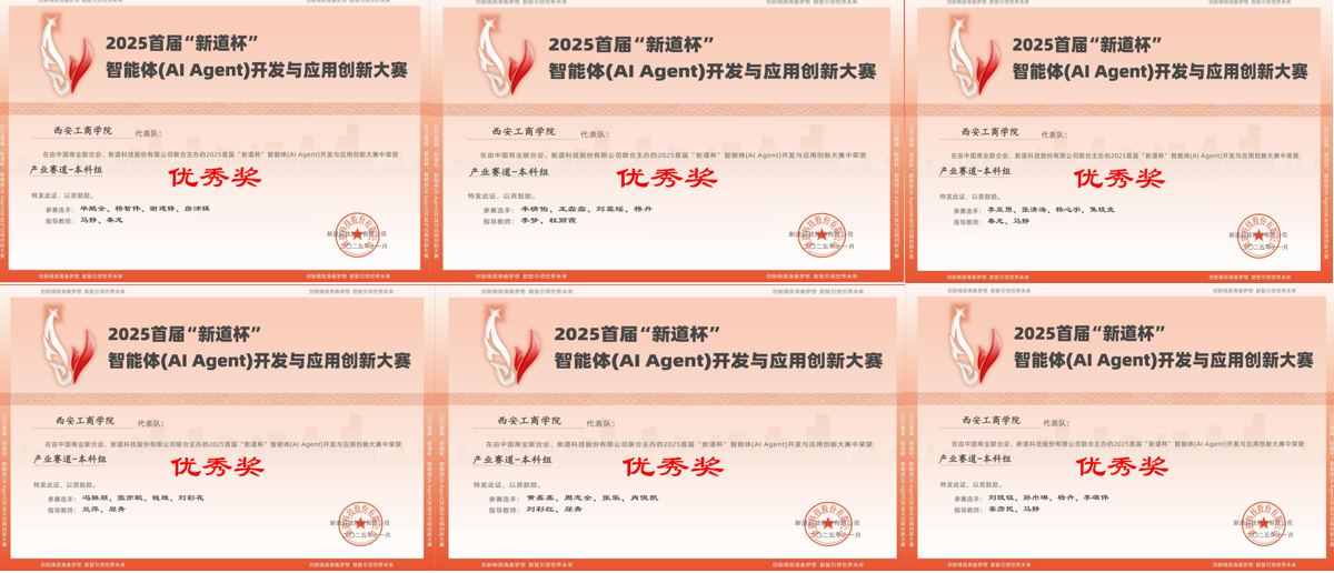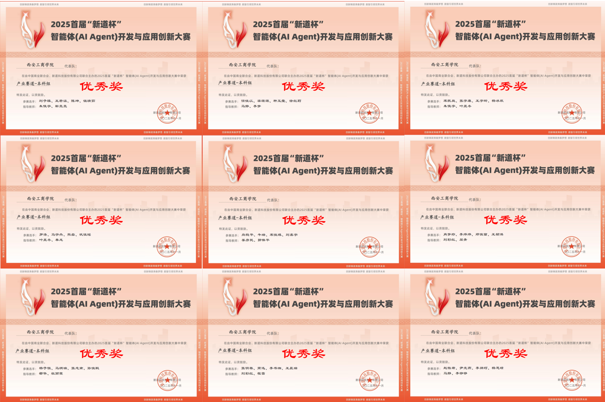 近日,“2025首届‘新道杯’智能体(AI Agent)开发与应用创新大赛”圆满落幕。西安工商学院信息工程学院(新E代数智未来产业学院)积极组织本次竞赛,学生组共计参赛28组,教师组参赛6组。师生在比赛中表现优异,郭保平老师在教师赛道中获得优秀奖,学生赛道中由刘彩红、姜彦民、屈青、马静、叶昱冬、秦龙等15位老师指导的15组学生团队均荣获优秀奖。