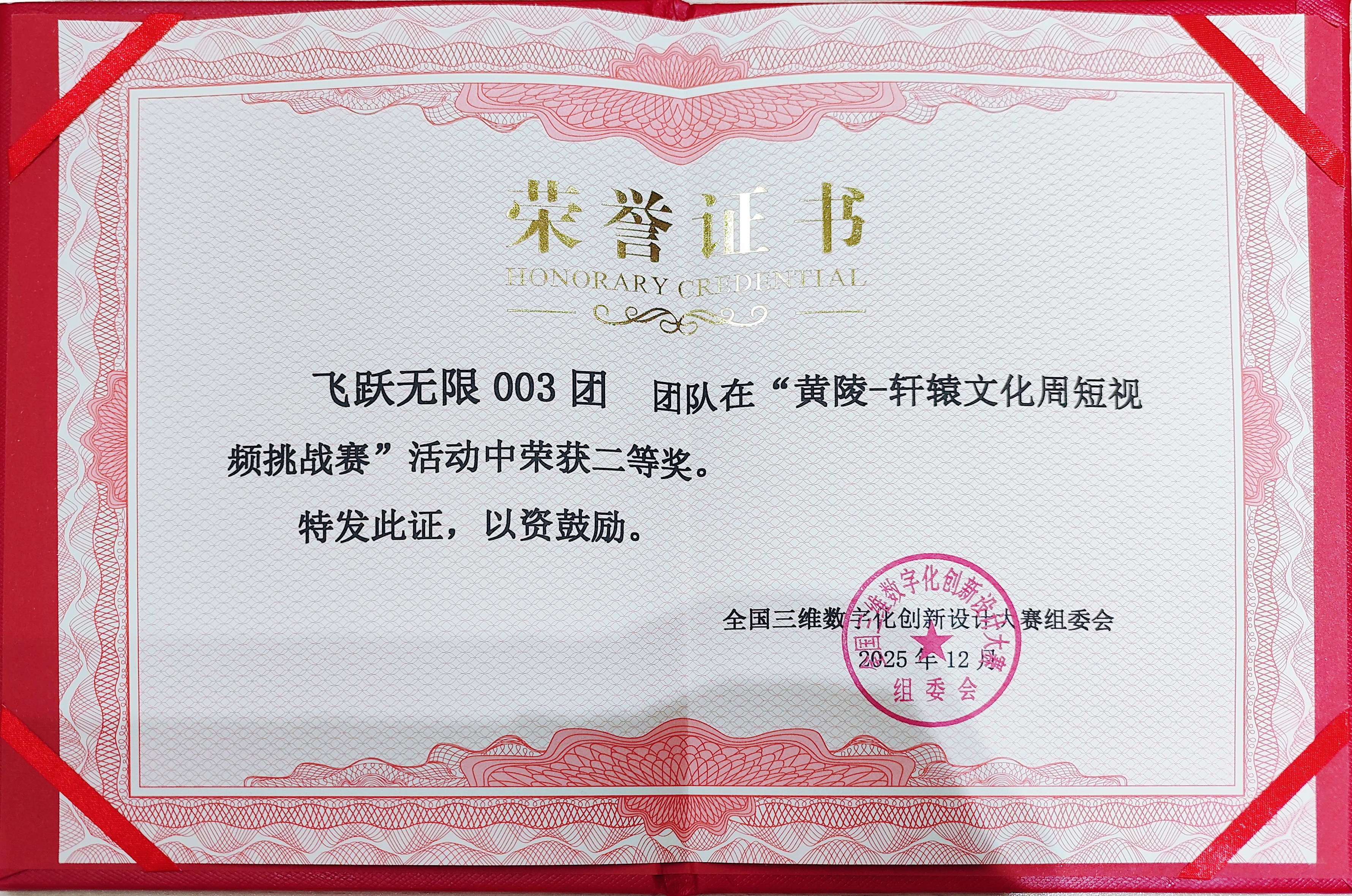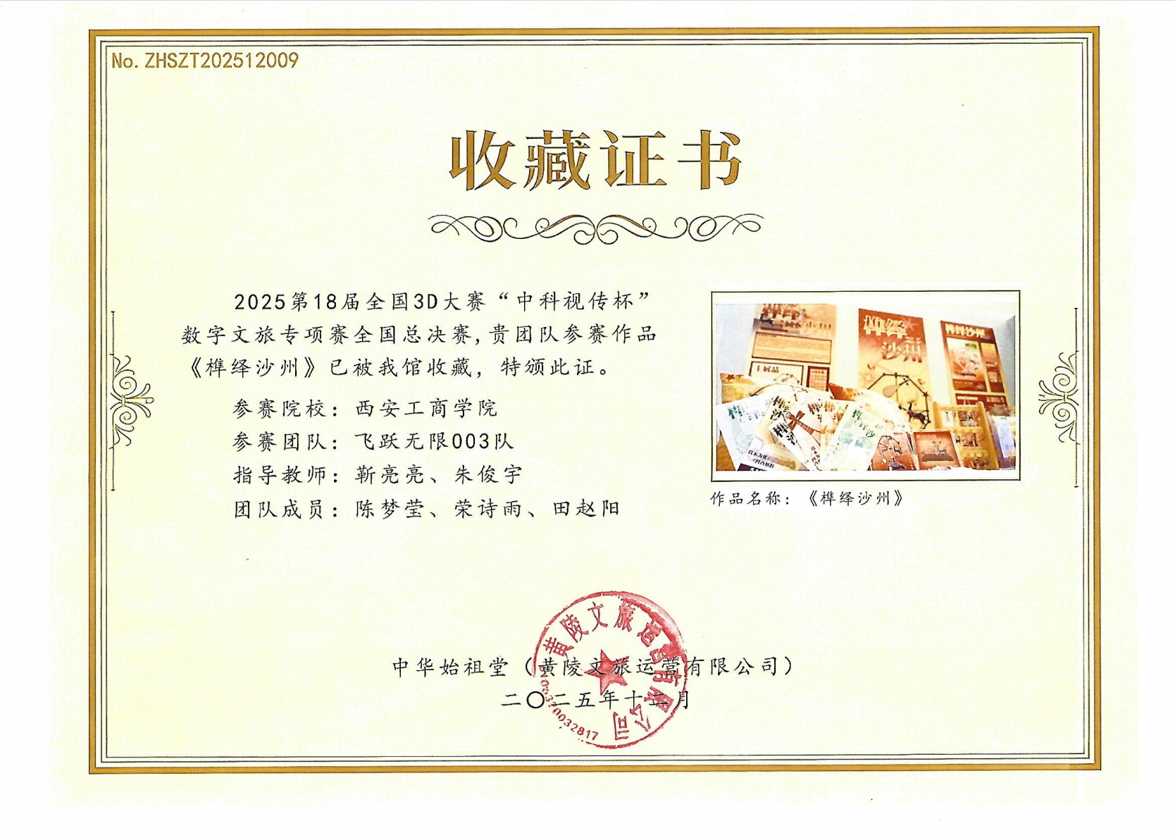 2025年12月,第18届全国三维数字化创新设计大赛“中科视传杯”数字文旅专项赛全国总决赛传来捷报:西安工商学院飞跃无限003团队的作品《榫绎沙州》不仅斩获全国三等奖,更获中华始祖堂正式收藏,喜提收藏证书(编号:No.ZHSZT202512009),成为青年群体用数字技术传承传统文化的亮眼例证。同一时期,团队参与“黄陵-轩辕文化周短视频挑战赛”的作品《昆仑子-生命礼赞》亦荣获二等奖,双线赛事的佳绩,彰显了传统文化与数字创新融合的强大生命力。