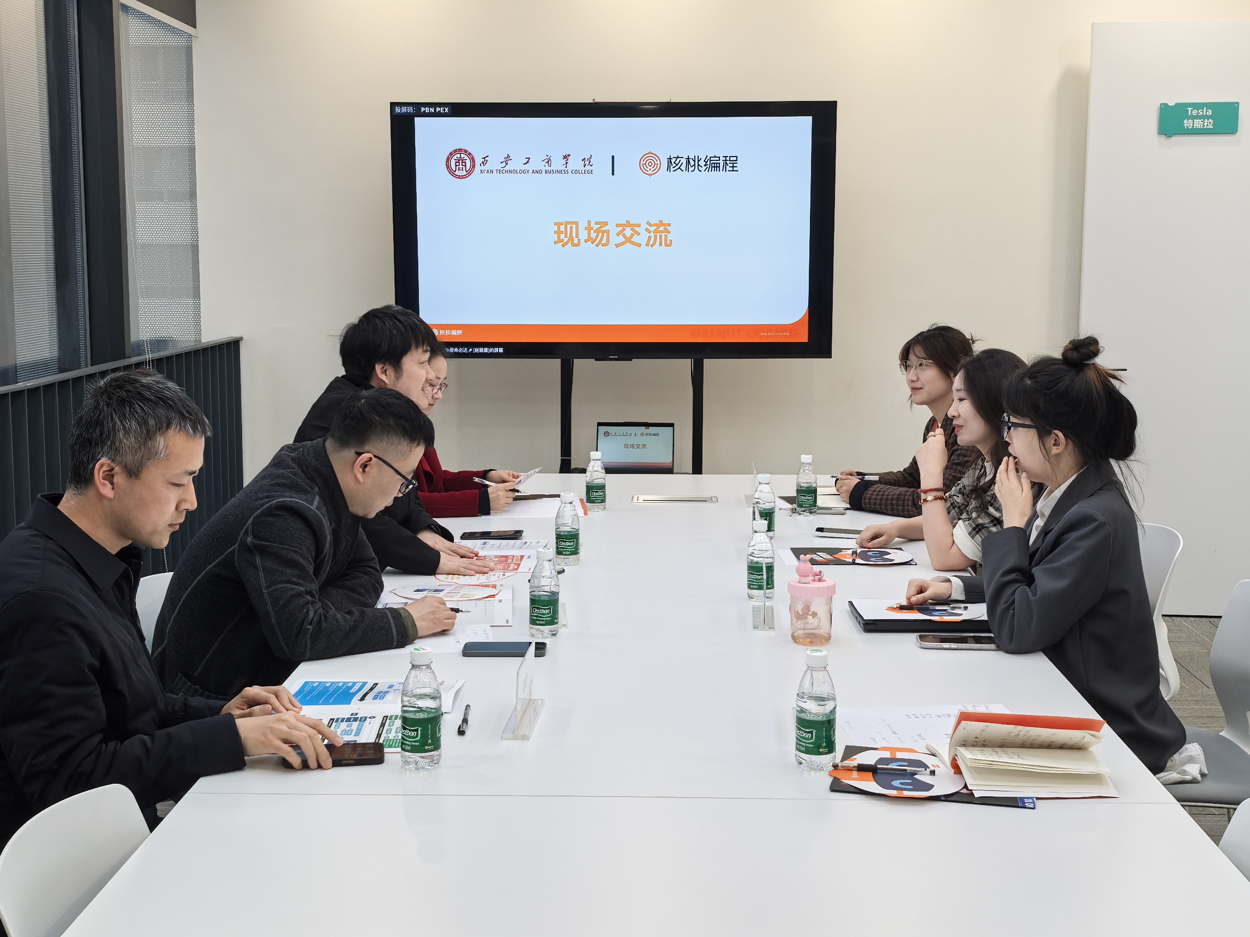 活动伊始,在苗洁等人的陪同下,学院到访团队先后参观了核桃编程西安分公司的办公环境、教学实训区域,直观了解了企业的办公氛围、管理模式及业务开展情况。随后,核桃编程各位负责人详细介绍了核桃编程的发展历程、核心业务、行业地位及未来发展规划。作为国内青少年编程教育领域的领先企业,核桃编程自成立以来,已发展成为拥有超千万学员的综合性编程教育平台,在西安布局的分公司更是为本地高校毕业生提供了大量优质就业岗位,其成熟的“教学—训练—竞赛—认证”一体化育人模式,与学院人才培养理念高度契合。